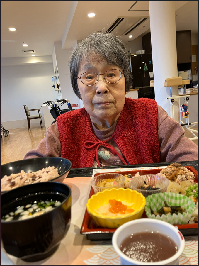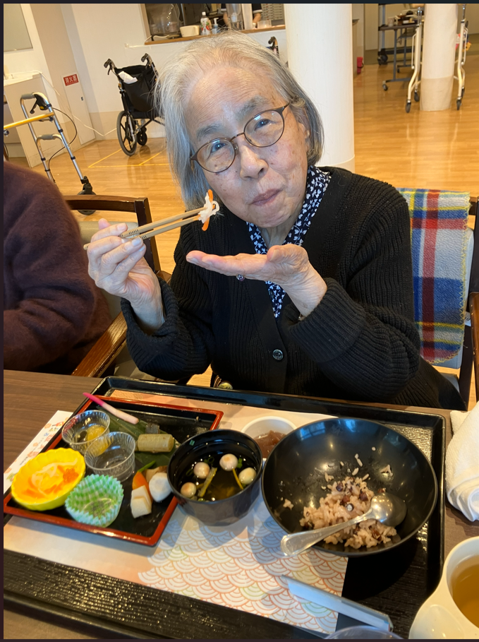 ご飯は、お祝いの気持ちを込めてお赤飯をご用意し、彩り豊かな御膳を召し上がっていただきました。品数豊富でボリューム満点ではありましたが、「こんな豪華な物食べて良いの?」「彩りも良くて、良い一年の始まりですね」といった嬉しいお声が聞かれ、完食される方も多くいらっしゃいました。